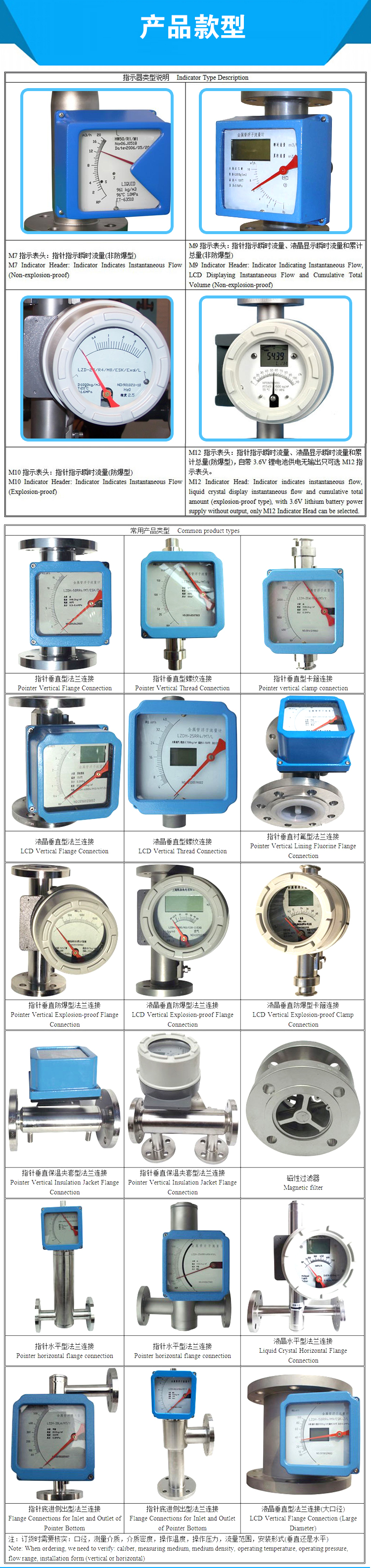特殊類型:繼電器輸出(觸點容量5A@250 VAC)脈沖輸出:累積脈沖輸出,*小間隔50毫秒。液晶顯示:瞬時流量顯示數值范圍:0-50000。累計流量顯示值范圍:0-99999999。防護等級:IP65防爆標志:本質安全型iaIICT6隔爆型dII CT6。金屬管浮子流量計的安裝方式。