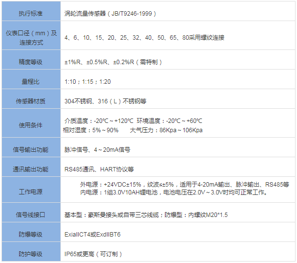 三、小口徑渦輪流量計技術(shù)參數(shù)