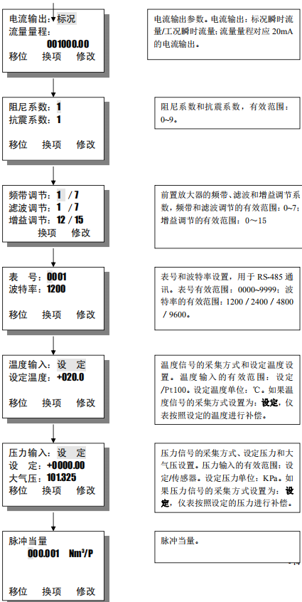 2、瞬時流量可切換顯示標況體積流量(Nm3/h)和工況體積流量(m3/h),*多可保留 3 位小數,顯示*大值為 9999999;